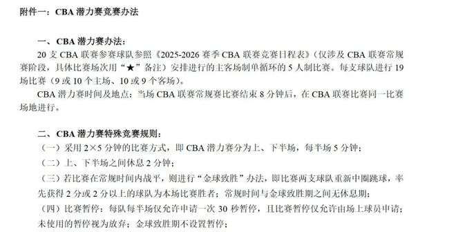 中国篮协的一纸公告让整个篮球圈炸开锅!2025-26赛季CBA联赛将迎来史上最颠覆性改革:常规赛每节时间从12分钟缩短至10分钟,更震撼的是新增设“第五节”——专属替补球员的“CBA潜力赛”。这项开创世界先河的赛制,将在常规时间结束8分钟后开打,分为上下半场各5分钟,战平则启动“金球致胜”规则,瞬间决定胜负。