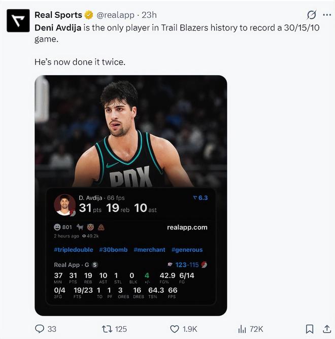 阿夫迪亚在对阵雷霆一战中拿到31分19篮板10助攻,就差1个篮板球就会创造盖世纪录,全场比赛仅出战37分钟, 14中6,罚球23中19,命中率42.9%,本赛季他的侵略性非常之足,以色列乔丹之名绝非浪得虚名。
